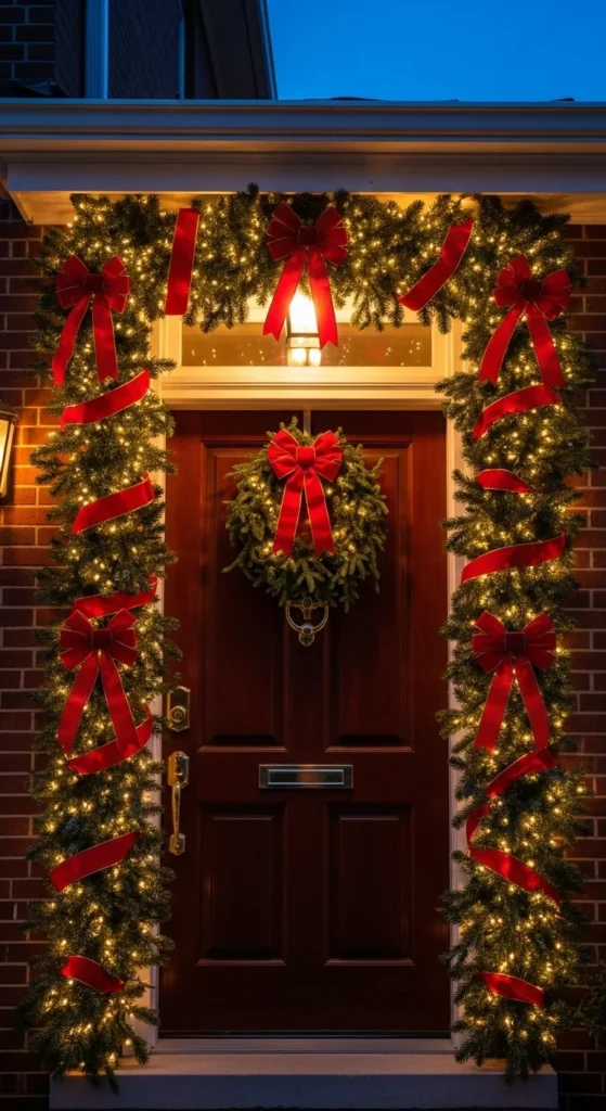 Start with the timeless classic — a garland-wrapped doorway. Use fresh pine or high-quality faux garlands to frame your door. Weave in string lights and red velvet ribbons for a festive touch. Add pinecones or small ornaments for texture. This simple yet stunning setup instantly creates a welcoming entrance that feels both cozy and elegant.