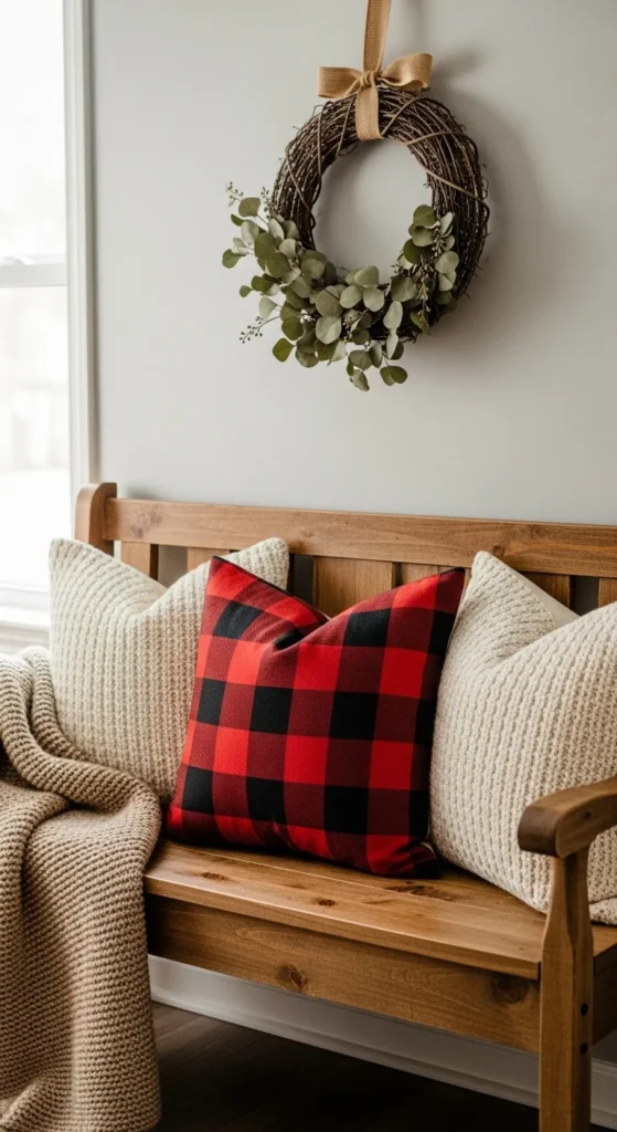 Turn your entryway bench into a festive vignette. Add seasonal throw pillows in plaid or velvet, and drape a soft blanket over the edge. Hang a wreath or artwork above it for balance. It’s functional, cozy, and picture-perfect for welcoming guests.