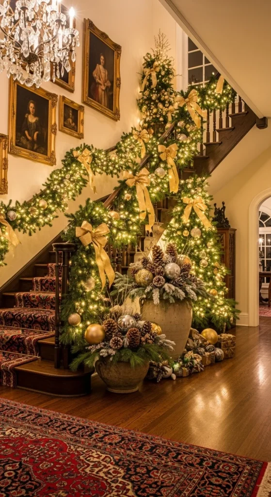 If your entry has stairs, make them sparkle. Wrap garland and lights along the banister. Add gold or red ribbon for dimension. It’s one of the easiest ways to make your entry feel luxurious and festive from the moment guests step inside.
