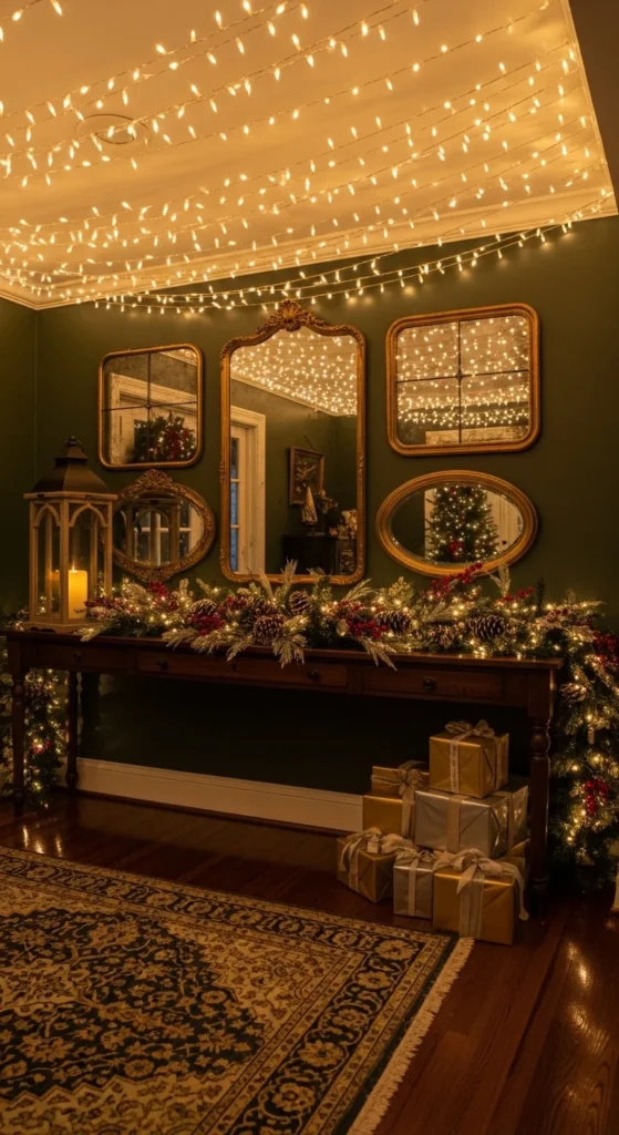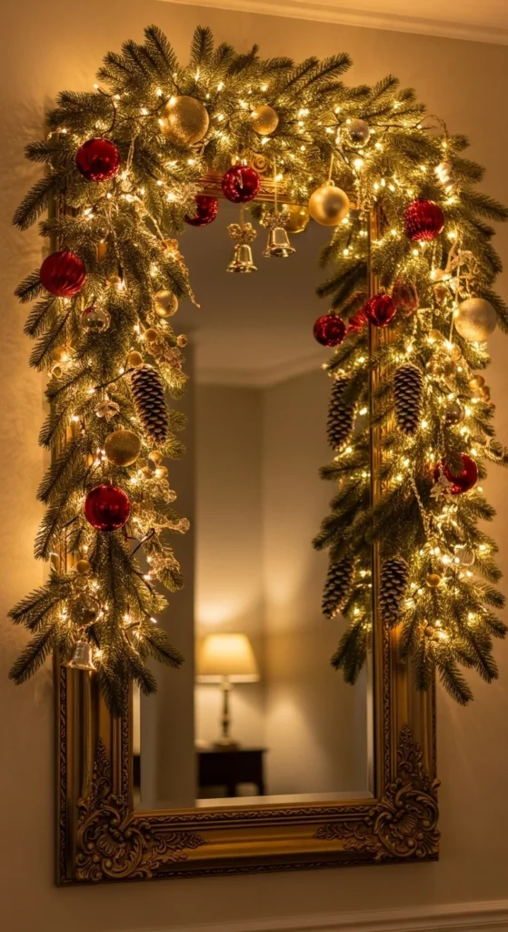 Dress up your mirror with a garland border. It reflects light beautifully and adds visual warmth. You can even hang small ornaments from the corners. The reflection doubles the glow from nearby candles or string lights, creating a cozy holiday atmosphere.