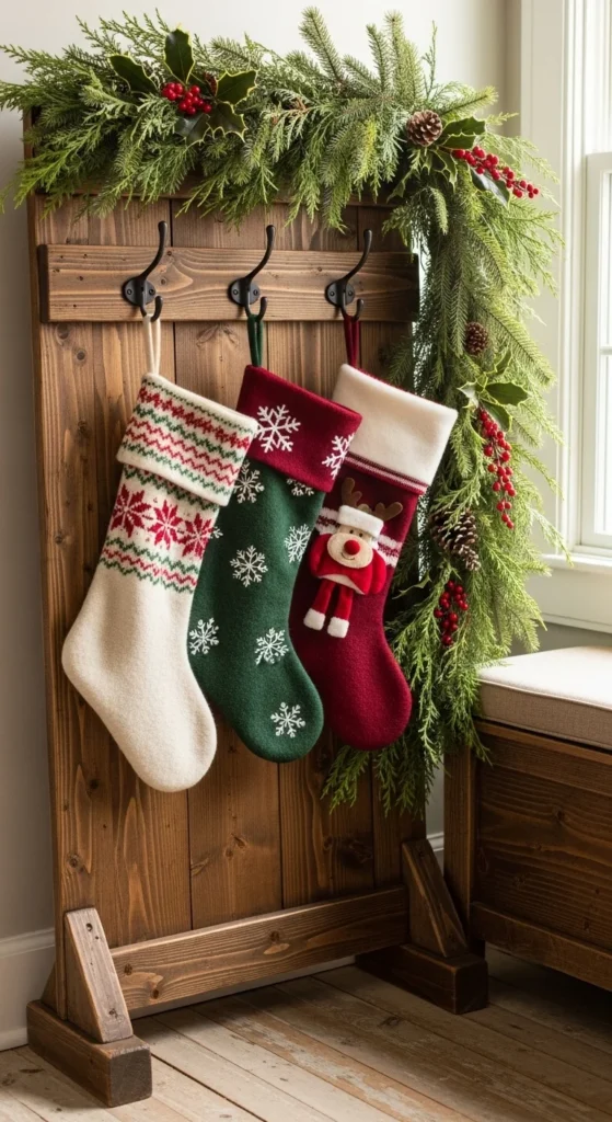 Hang stockings outside the fireplace zone this year. A stocking display rack by the entryway gives your home a warm, family-centered vibe. Mix classic red stockings with patterned or knit ones for variety. Add a few sprigs of greenery to tie it all together.