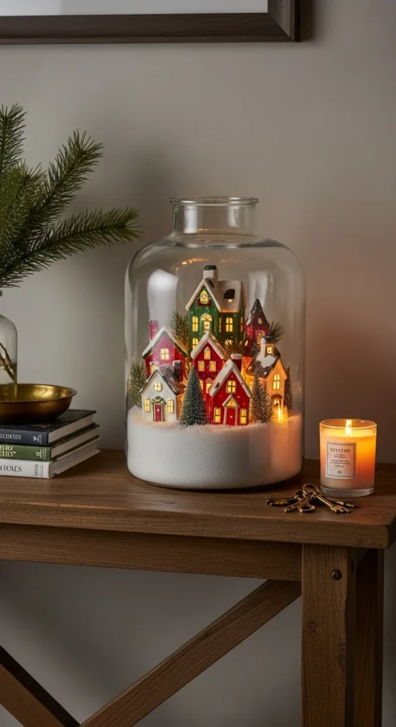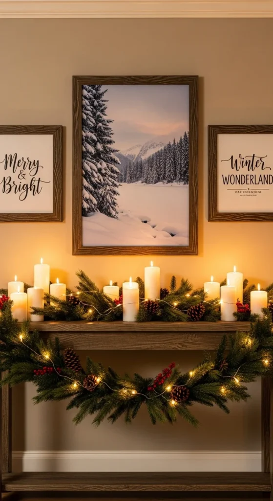 Change your entry wall decor with seasonal artwork. Frame Christmas quotes, snowy prints, or vintage holiday ads. Combine with candles and small garlands for depth. It’s an easy swap that instantly transforms your space without cluttering it.