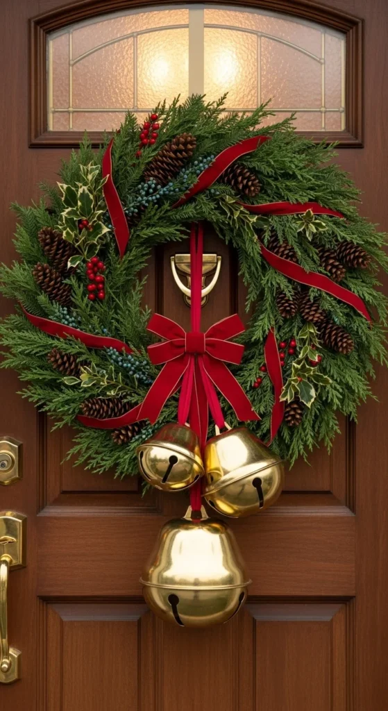 Add a cheerful sound to your decor. Hang oversized jingle bells from your door handle or garland. Choose metallic tones like gold or bronze for sophistication. Every time the door opens, the soft chime brings holiday cheer — a charming sensory detail your guests will remember.