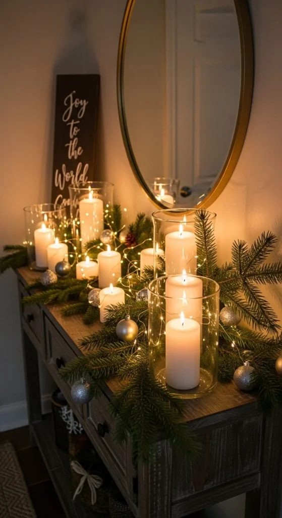 Turn your console table into a holiday display zone. Layer greenery, candles, and ornaments. Mix materials — glass, wood, and metal — for balance. It’s easy to adjust for your home’s color scheme and creates an inviting first impression.