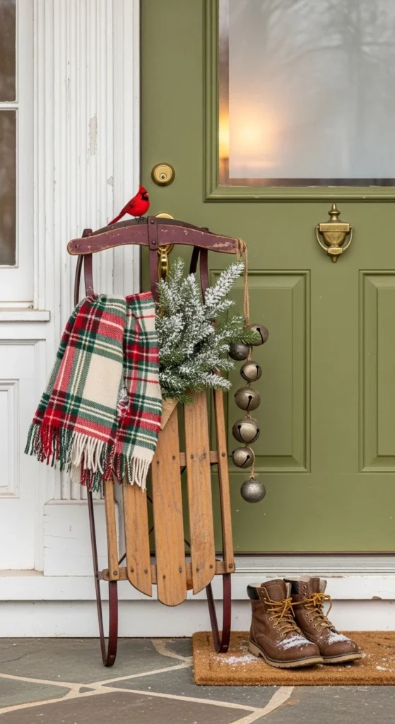 Bring nostalgia to your porch with a decorative sled. Use an old wooden sled or thrift-store find. Drape it with plaid fabric and greenery. Lean it casually near the door or against a wall. It adds charm and a sense of winter adventure to your entryway.