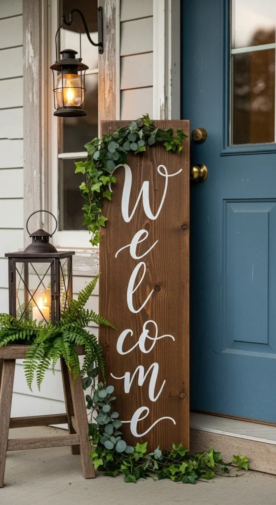 A handcrafted wooden welcome sign adds warmth and personality. You can buy one or make it yourself with reclaimed wood and paint. Pair it with a small wreath or lantern at the base. It’s an affordable way to make guests feel greeted before they even ring the bell.