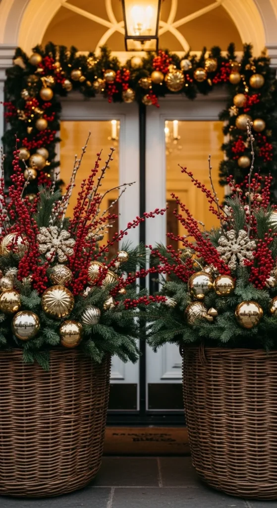Upgrade your usual planters for the season. Use woven baskets instead of pots, and fill them with pine branches, ornaments, and ribbon. Add string lights for glow. This natural texture pairs beautifully with wood and stone porches, giving your home that charming “mountain lodge at Christmas” feel.