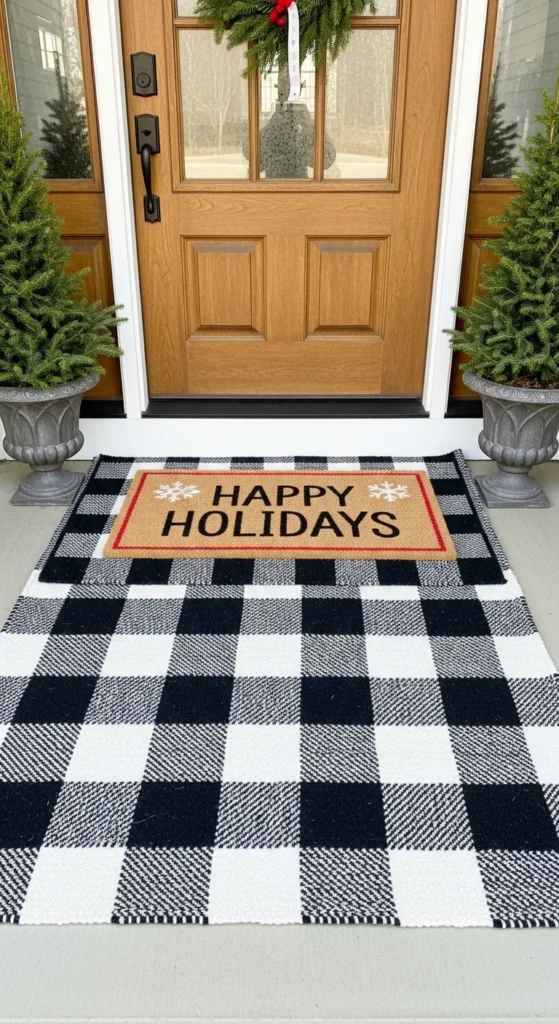 Layered mats add instant charm. Start with a neutral base rug and top it with a Christmas doormat featuring festive text or patterns. Add greenery or a pair of small planters beside it. This trick adds depth and style — and keeps your entryway practical yet photo-ready.
