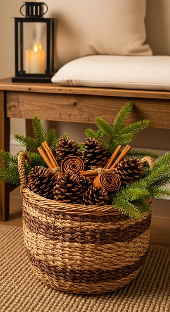 Nothing says natural Christmas charm like a basket of pinecones. Fill a large wicker basket with real or faux pinecones, cinnamon sticks, and small ornaments. The natural textures and woodsy scent bring warmth. It’s a budget-friendly idea that works for both indoor and covered outdoor entryways.