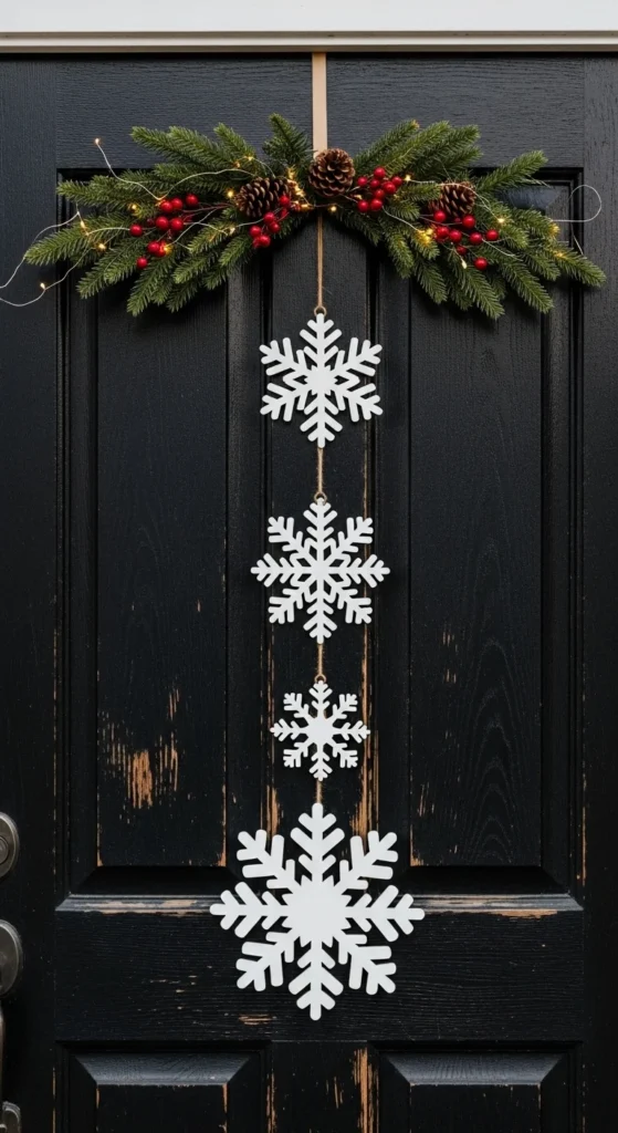 Swap the typical wreath for a cluster of snowflake hangers. Use different sizes for variety. You can paint them metallic or matte white for a frosted look. Combine them with fairy lights or garland for a layered design that feels wintry and cheerful.