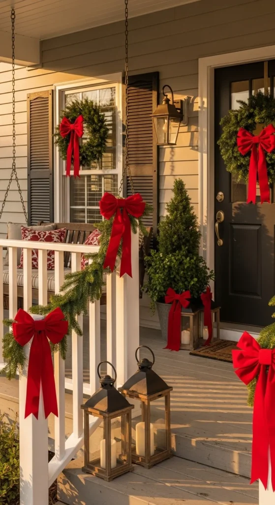 A simple bow can transform any space. Add red velvet or plaid ribbons to lanterns, doorknobs, railings, and garlands. They bring consistency and color without adding clutter. This tip works especially well for small entryways — festive without taking up extra space.