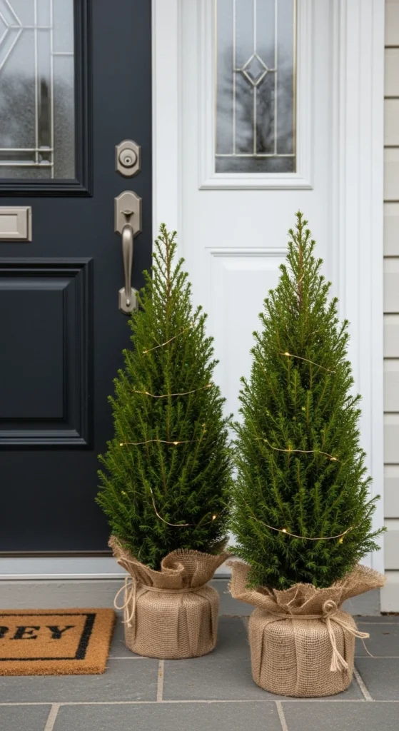 Flank your entry with mini trees. Use small evergreens or faux versions and decorate with string lights or ornaments. Wrap the pots in burlap or festive fabric for charm. It creates symmetry and looks polished, perfect for doorways or porches of any size.