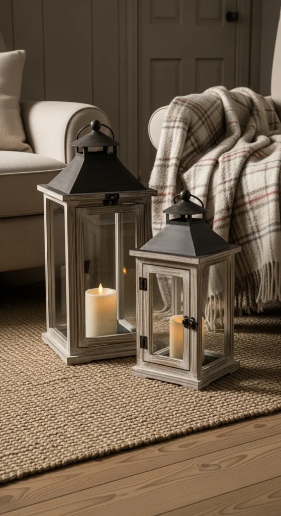 Wooden candle lanterns bring soft farmhouse glow to any corner of your home. Choose lanterns with chipped paint or unfinished wood for an aged feel. Add LED candles for safety and steady warm lighting. Tuck in small pine sprigs or red berries for color. Place them by the fireplace, entry bench, or stair landing. You can even swap seasonal fillers inside the lantern to stretch its use all winter.