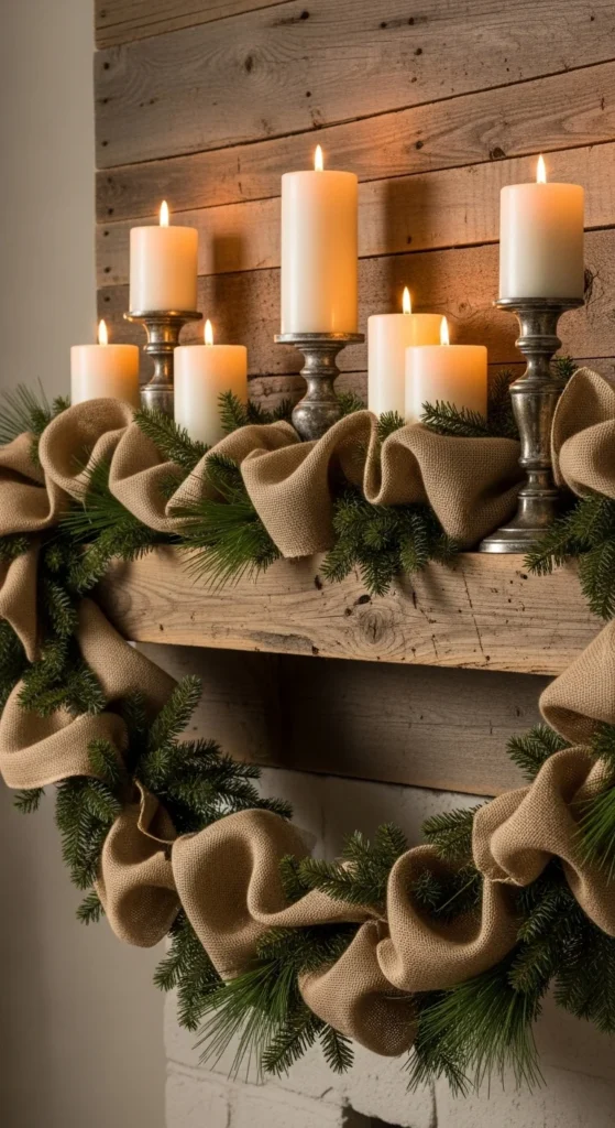 Burlap ribbon adds earthy texture to any mantel. Mix it with pine garlands for a wonderfully cozy result. Let the ends hang naturally for a relaxed farmhouse look. Add a few brass candlesticks or lanterns for contrast. This setup works well even in small spaces because it doesn’t feel cluttered. Burlap is inexpensive, so it’s a great option for large mantels.