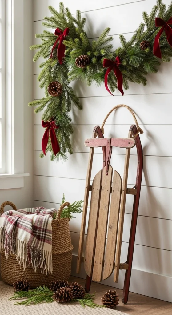 Vintage sleds bring nostalgic farmhouse charm. Lean one against your porch wall or entry hall. Add a simple bow or greenery for holiday flair. You can distress a new sled with sandpaper and chalk paint for the same look. Pair it with a woven basket or lantern for a thoughtful display.