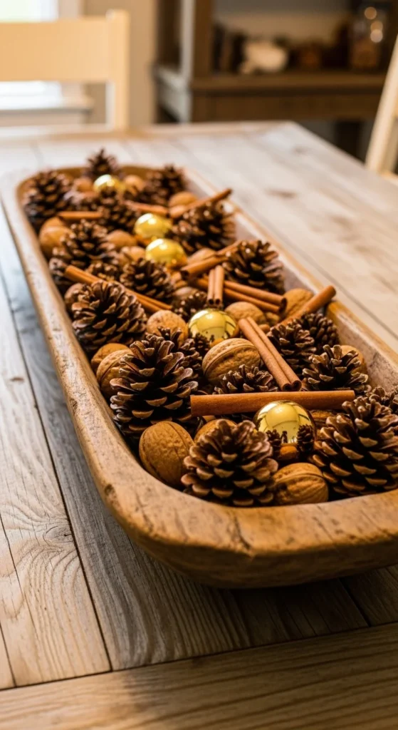 Dough bowls create beautiful centerpieces with almost no effort. Fill yours with pinecones, spices, or small ornaments. The natural wood tone adds warmth. This works on dining tables, coffee tables, or kitchen islands. Swap the fillers throughout winter to keep the display interesting. Cinnamon sticks add a subtle holiday scent.