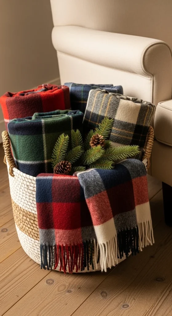 A woven basket brings texture and warmth to any farmhouse room. Fill it with plaid throws or soft knits. Add a touch of greenery for a holiday nod. It’s practical, tidy, and aesthetically pleasing. This idea works especially well for guest rooms or living rooms. Use inexpensive baskets from discount stores and customize them with simple tags or ribbons.
