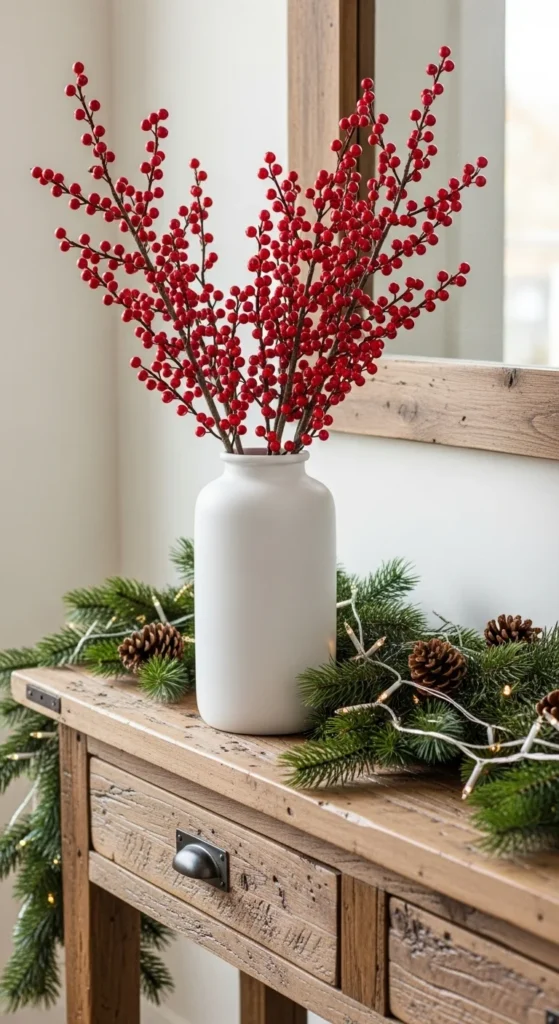 Red berry stems add bold but simple holiday color. Place them in a white or neutral vase to keep the scene calm. This arrangement feels seasonal without overwhelming the space. Add a few pine sprigs for softness. These stems last all winter and require no watering. It’s one of the easiest ways to bring cheerful texture into farmhouse decor.