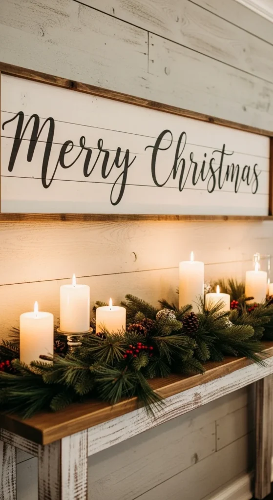 Farmhouse wall signs look wonderful above entry tables, mantels, or dining spaces. Choose natural wood or distressed white backgrounds. Simple black lettering keeps everything tidy and calm. Pair the sign with greenery, a lantern, or a bowl of ornaments. If you’re crafty, make one yourself using stencils and reclaimed wood.