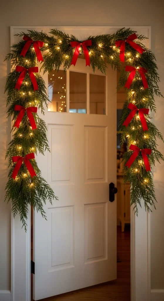 Framing a door with cedar garland creates a welcoming mood. Use command hooks to avoid wall damage. Add a slim ribbon for subtle color. This works for kitchens, hallways, and living rooms. The fresh greenery scent adds comfort. LED micro-lights make the garland glow softly without overpowering the space.