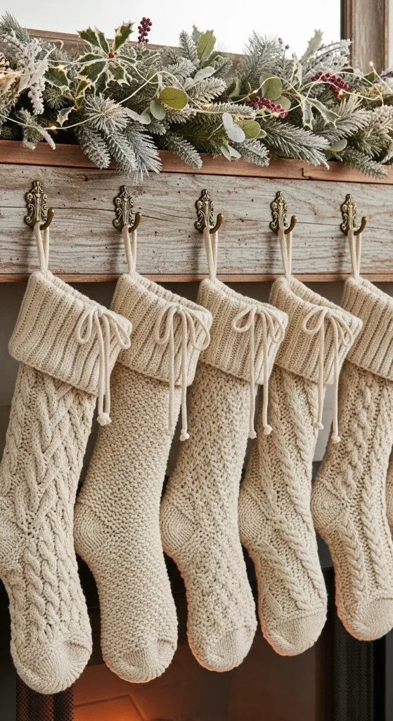 Chunky knit stockings bring a comforting farmhouse softness. Look for thick yarn in shades of cream or taupe. Hang them on a weathered mantel using simple brass hooks. Add a short string of warm lights above them for a gentle sparkle. To save money, use inexpensive jumbo yarn and knit your own simple tube shape. They fill space beautifully and make your fireplace feel warm without over-decorating.