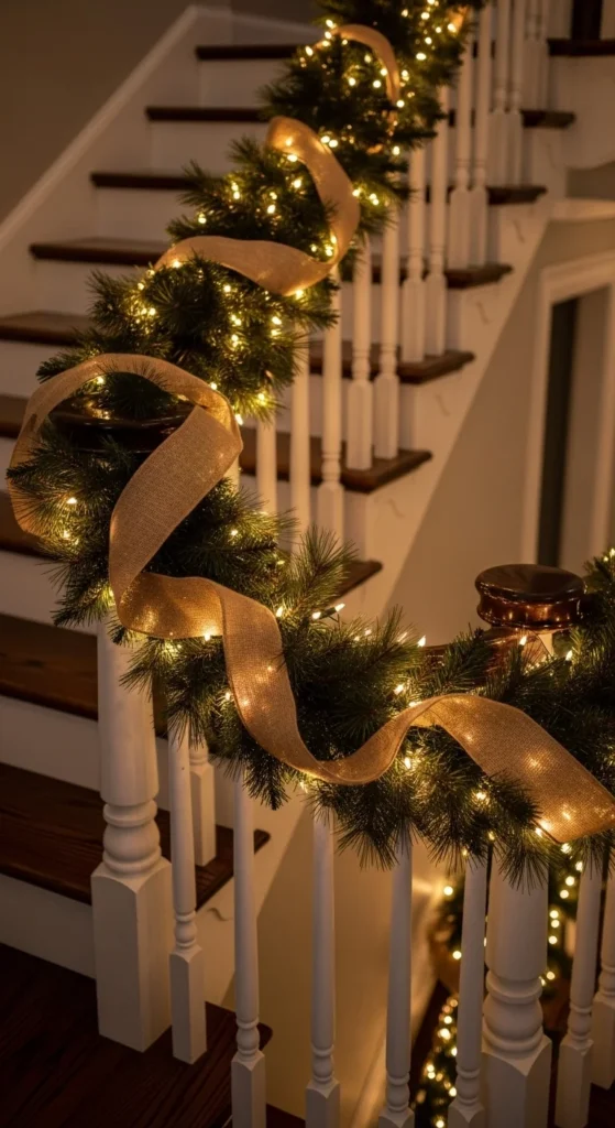 A farmhouse staircase feels warm and inviting with burlap and pine. Wrap the garland loosely for a casual drape. Tuck in pinecones or berry stems for color. LED lights add a gentle glow that feels calming at night. This look works in narrow stairways too since it doesn’t appear crowded. Use floral wire to secure everything without damaging the railing.
