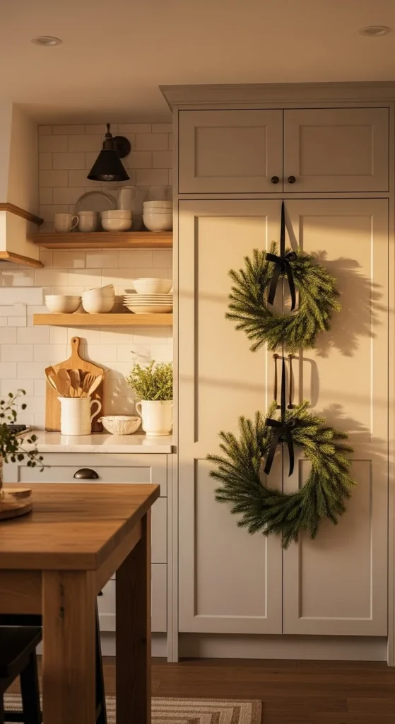 Hanging small wreaths on kitchen cabinets brings subtle charm to a space that often gets ignored. Choose identical wreaths to keep everything tidy. Hang them with thin black or plaid ribbon for a soft farmhouse look. It’s an easy project that takes only minutes but changes the feeling of the entire room. Add tiny bells or berry stems if you want a bit more personality. Use removable hooks to avoid damaging your cabinet doors. This idea pairs beautifully with wooden cutting boards, ceramic pitchers, and simple countertop garlands.