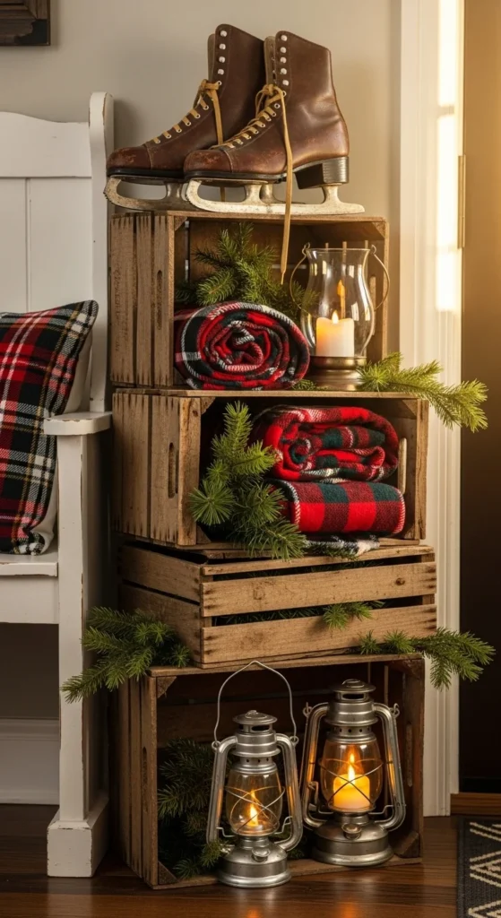 Wooden crates make wonderful farmhouse displays for your entry. Stack them vertically or stagger them for texture. Fill each crate with items like pine branches, lanterns, blankets, or vintage finds. This arrangement is flexible and budget-friendly because you can use what you already have. Add a pair of old skates or a small wreath for a nostalgic touch. Keep the palette warm and simple. Place the crates near your entry bench so the whole space feels connected. It’s an easy way to greet guests with quiet charm and make your home feel welcoming as soon as they step inside.