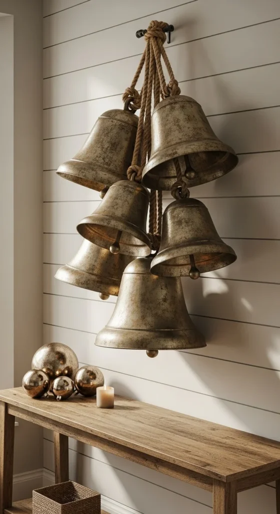 Metal bells instantly create a charming countryside mood. Choose bells with a matte or brushed finish rather than polished shine. Tie them with thick jute rope and hang them on a hook or front door handle. They pair beautifully with pine garlands and simple wooden signs. You can even spray-paint thrifted bells in brass or aged bronze tones to make them look new.