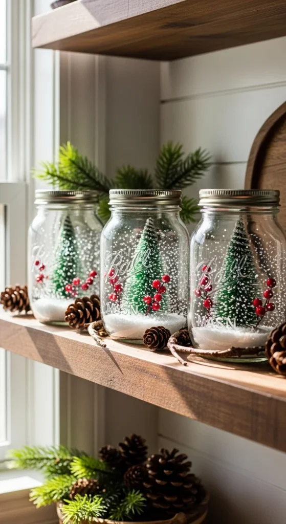 Mason jar snow globes are simple, charming, and easy to DIY. Fill them with mini bottle-brush trees, faux snow, or tiny vintage ornaments. Add a bit of hot glue to keep items from shifting. Group several jars together on shelves or window sills. They create a cheerful but calm scene. Choose different jar heights to create subtle visual rhythm.