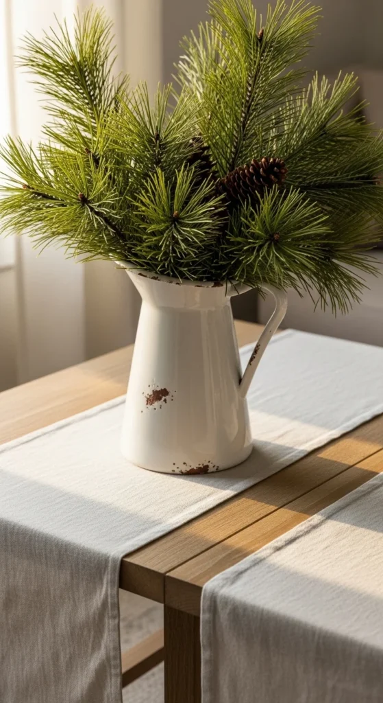 A farmhouse pitcher filled with greenery feels both calming and seasonal. Look for ceramic or metal pitchers with chipped or worn edges. Add fresh pine, cedar, or eucalyptus. This is an easy way to bring natural farmhouse texture into your home. Place the pitcher on a coffee table, entry console, or kitchen island. Swap greenery throughout winter for a longer-lasting display.
