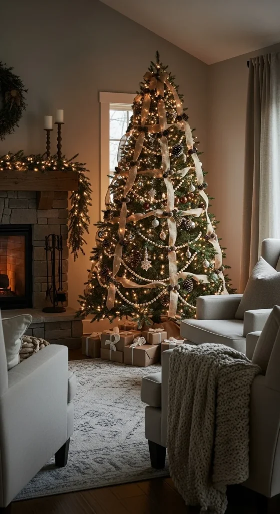 Wood bead garlands give your tree an earthy, handcrafted feel. Choose natural, unfinished beads for the pure farmhouse look. They’re easy to make with twine and loose beads. Drape them loosely around your tree or layer with burlap ribbon. You can also place them in bowls or across mantels for added warmth. They add gentle texture without overwhelming your decor.