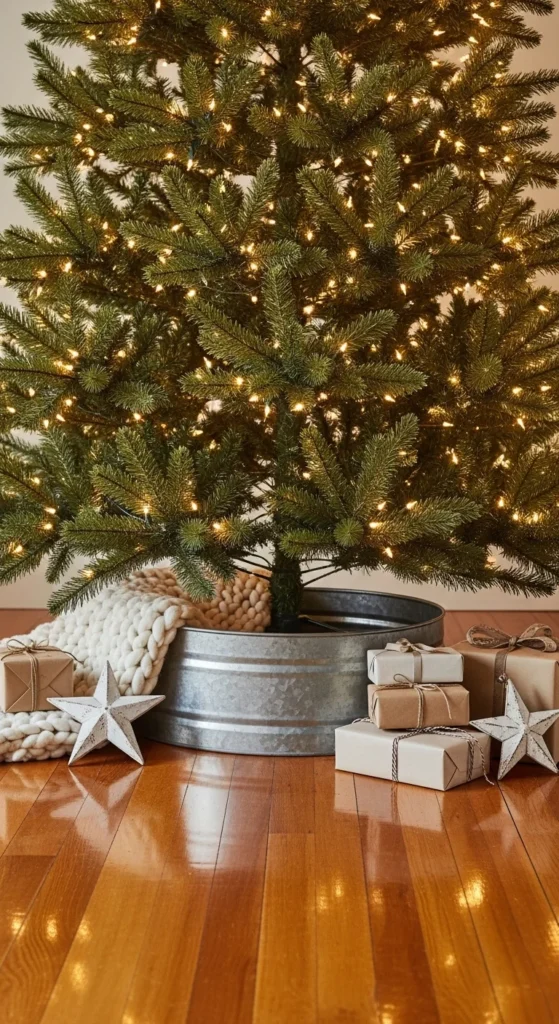 A metal tree collar sharpens the farmhouse style instantly. Galvanized finishes work well with neutral decor. They hide tree stands while keeping the look simple and tidy. Choose one with a hammered or lightly worn finish for more character. This piece pairs perfectly with buffalo check accents or wooden ornaments.