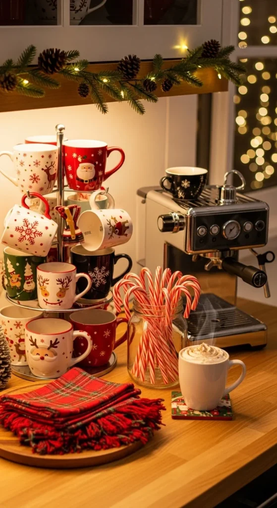Turn your morning coffee ritual into a cheerful moment. Set up a Christmas coffee station with festive mugs, flavored syrups, and candy canes as stirrers. Add a mini wreath or a strand of fairy lights above your coffee maker. Use a red plaid tray for organization. It’s a simple touch that instantly brings warmth and joy to your kitchen routine.