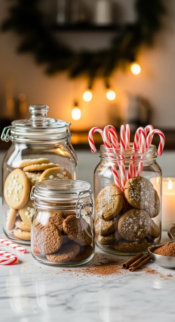 Decorate your counters with filled cookie jars — they double as decor and treats. Use clear containers and fill them with cookies, peppermint bark, or hot cocoa mix. Tie each jar with ribbon and add a tag. It looks adorable and makes snacking festive and easy.