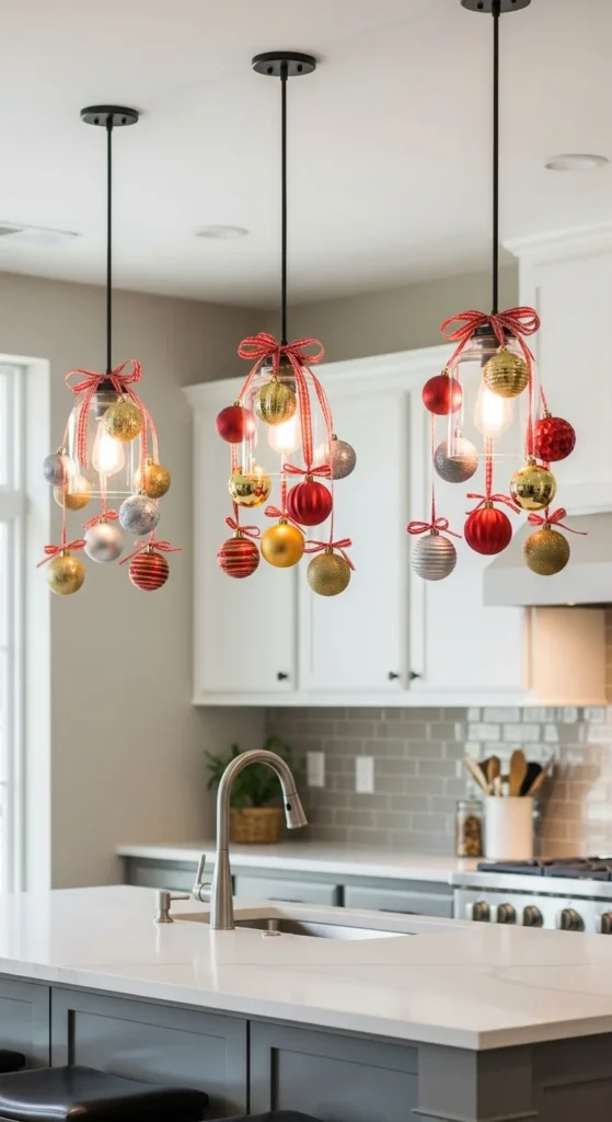 If you have pendant lighting, hang ornaments or snowflakes from them with ribbon. Use lightweight decorations to avoid stress on fixtures. Choose metallic tones for a luxe touch or colorful ones for a playful feel. It’s creative and adds instant holiday sparkle right where you cook and gather.