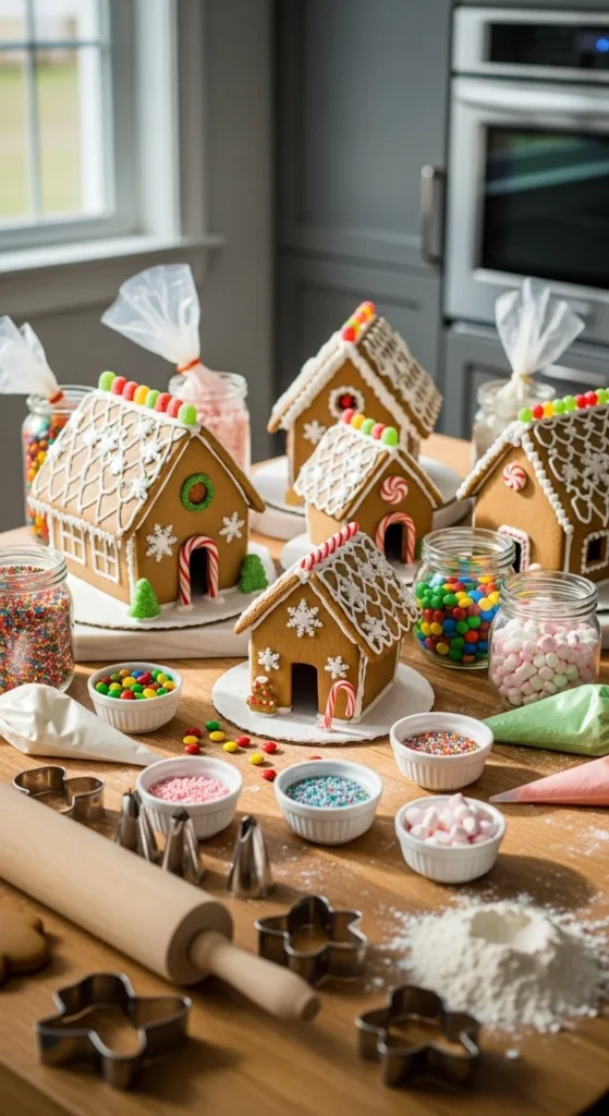Make decorating part of your decor. Display your gingerbread houses on the counter or island. Surround them with faux snow and candy jars for a whimsical setup. It’s a fun project with kids and doubles as a charming holiday centerpiece.