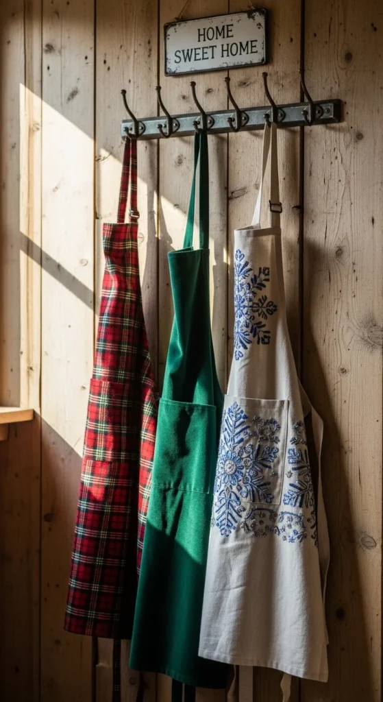 Hang festive aprons for both function and decor. Choose themed fabrics like plaid, tartan, or embroidered snowflakes. Display them on hooks near your cooking station. They’re practical and add a cozy touch that ties your kitchen theme together.