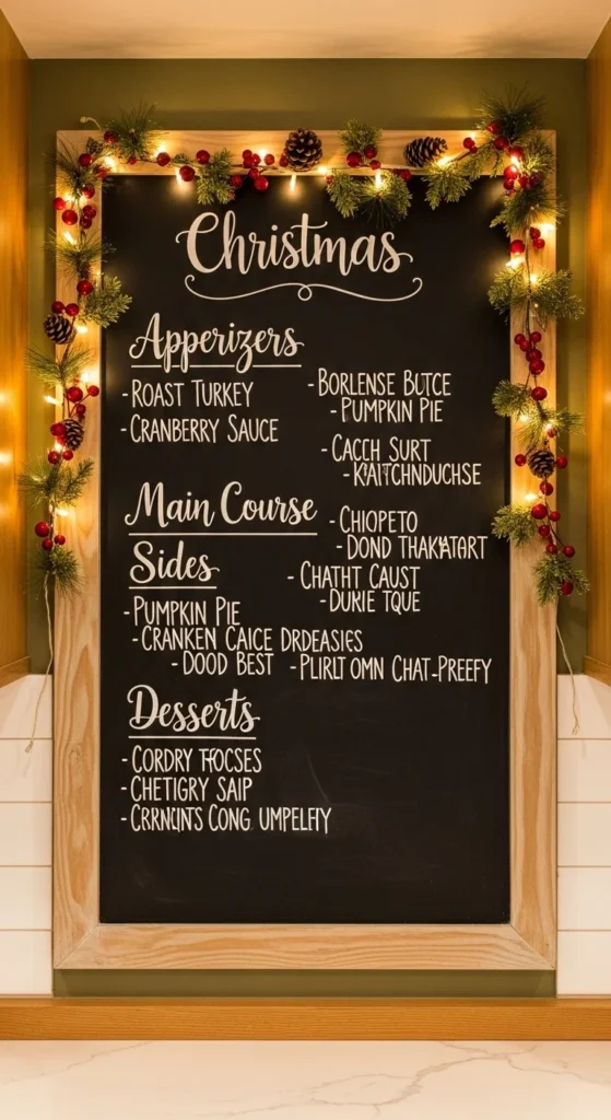 Turn your wall into decor with a holiday menu board. Write seasonal recipes, dinner plans, or countdown notes in chalk. Frame it with garland or lights. It’s creative, interactive, and keeps everyone excited for upcoming meals or baking sessions.