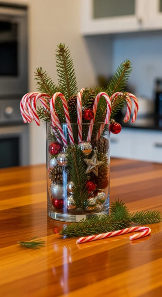 Use candy canes as decor by filling vases or jars with them. Add greenery or tiny ornaments for texture. It’s simple, affordable, and playful. Perfect for tabletops, islands, or open shelving to bring a sweet festive accent.