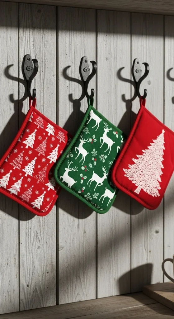 Swap your usual pot holders for seasonal ones. Choose patterns that match your theme — classic red plaid or cozy Nordic prints. Hang them visibly to add visual warmth. It’s a small, practical update that instantly reads Christmas.