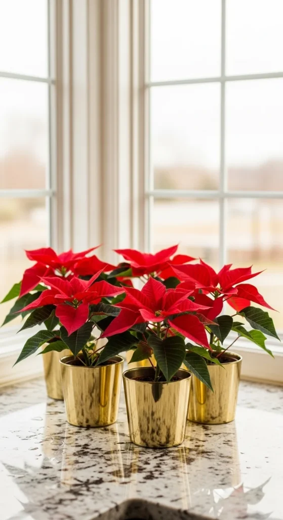 Add life and color with mini poinsettias. Their red blooms instantly make your kitchen festive. Use small pots or wrap the bases in burlap or foil. Line them up along your window or island. They’re low-maintenance and brighten the space beautifully.