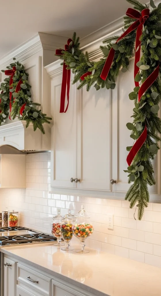 Cabinet garlands make your kitchen feel instantly merry. Use greenery garlands, either real or faux, and secure them with removable hooks. Add ribbons or berries for color. Drape them along cabinet tops or across window frames. It’s an easy project that brings the festive season right into your cooking space without taking up counter space.