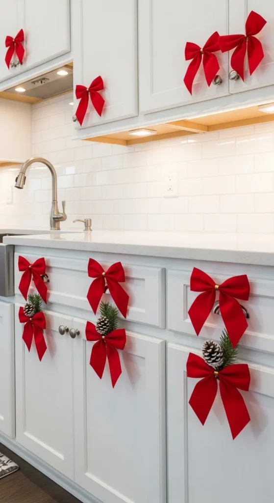 Dress up your cabinetry by tying red bows around the handles. Use satin or velvet ribbons for a luxe touch. It’s one of the easiest, most affordable decor hacks and takes just minutes. Perfect for renters who want quick holiday charm without permanent changes.