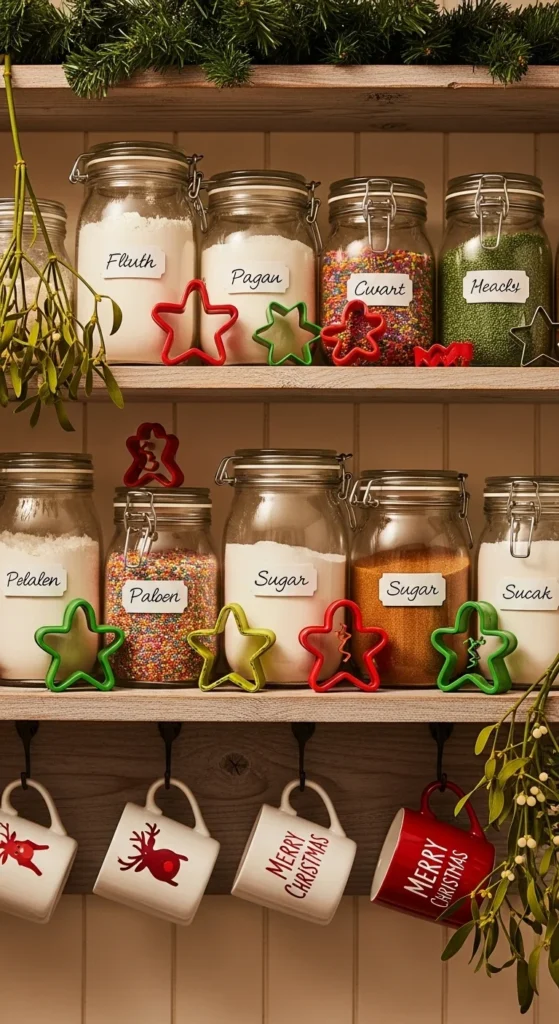 Turn your baking essentials into decor. Display ingredients in clear jars and line them up with cookie cutters, whisks, and Christmas sprinkles. Add garland or fairy lights around the shelf for a festive glow. It makes your kitchen look charming and keeps everything ready for spontaneous baking sessions.