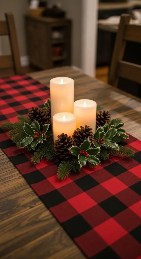 Add a festive table runner for instant warmth. Choose patterns like red plaid, snowflakes, or neutral linen with gold thread. Layer candles or pine branches down the center. It gives your eating area a holiday-ready look without requiring a full tablescape every day.
