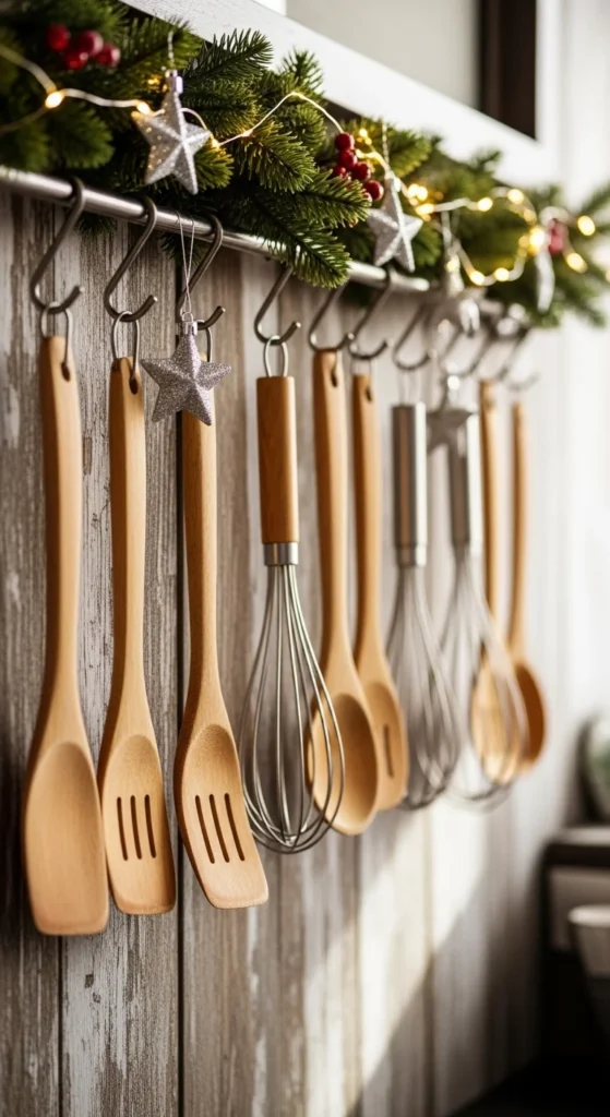 Repurpose your utensil rack into festive decor. Tie tiny ornaments or pine sprigs around your hanging utensils. Add a string of lights across the rail for sparkle. It’s simple, creative, and feels uniquely “kitchen Christmas.” Plus, it’s easy to take down after the holidays.