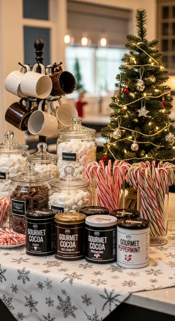 End with a cozy classic — the hot cocoa bar. Use a tray to hold mugs, cocoa mix, marshmallows, and candy toppings. Add mini chalkboard signs for fun labels. Place it near your coffee maker for convenience. It’s the ultimate kitchen feature that keeps everyone smiling all season long.