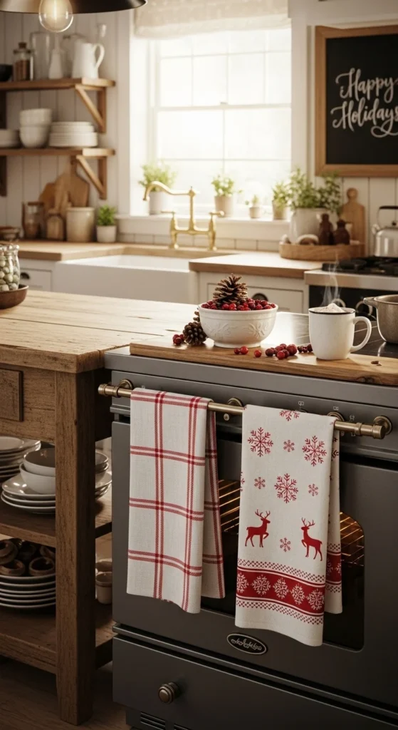 Swap your everyday linens for holiday-themed towels. Choose cheerful prints like snowflakes, gingerbread men, or red plaid. It’s a small swap that makes a big impact. Mix in textures like waffle weave or embroidered cotton for variety. This affordable change brings Christmas spirit to the heart of your kitchen.