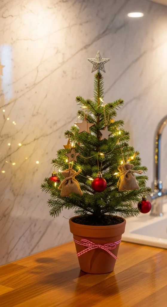 A miniature Christmas tree instantly adds charm to your kitchen. Choose a small potted fir or faux version that fits your countertop. Decorate with tiny ornaments, wooden beads, or twinkle lights. Place it near a window for natural light and sparkle. It’s a simple, joyful accent that doesn’t crowd your workspace.